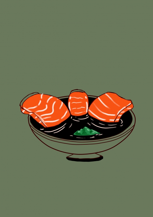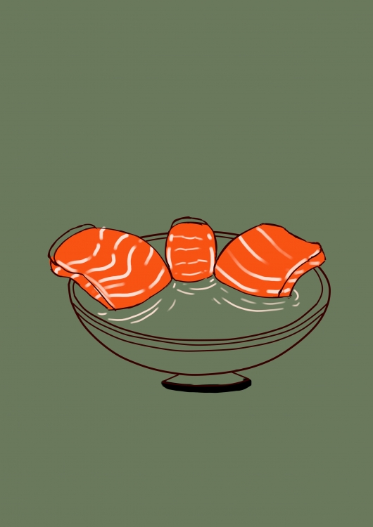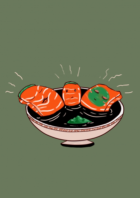 At the beginning of designing this picture, I decided to let the sashimi suffer in the hot springs, as sashimi is usually in the refrigerator and does not like the hot environment. However the final result makes people look strange. As a result I modified the expression of sashimi, from pain to enjoyment, and I was satisfied with the result of this contrast.