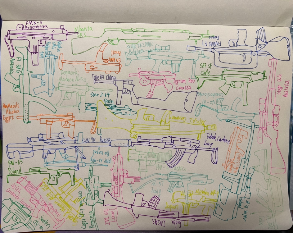 Context: This time the theme is Force, what comes to my mind is all kinds of military materials and war scenes and the characteristics of each country's army, but because I do not know much about this field, so I spent a lot of time looking for materials, and finally I chose guns, because this is the field I do not know the most and by making this work, I will get a deeper understanding, so I checked on the Internet I would like to call this painting a republic, because it contains guns from as many as 33 countries. Different colors represent each country has different gun design styles, and each country has different cultures, so I chose to use different colors to paint this colorful illustration. My next plan is to take this one illustration and maybe cut it into smaller pieces and then you can put them together, similar to a children's literacy game, which would be very interesting for people who are military illiterate.