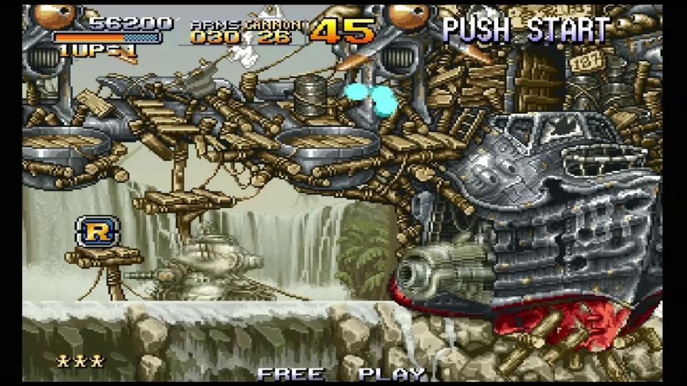 Metal Slug 1 (1996) is a 2D run-and-gun side scroller game about a marine cadet fighting waves of terrorists and defeating progressively larger super-weapons.