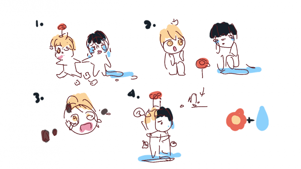 The story is about a friendship between two that goes like this; A little boy leaves flowers as he drags his friend who’s stumbling along leaving sad puddles along the way. But the flowers die soon after they leave the boy. The boy sees this and cries making the flower coming out of him come out broken and wilted. The puddle boy “waters” the flowers with his sadness and they grow bigger and happier than before