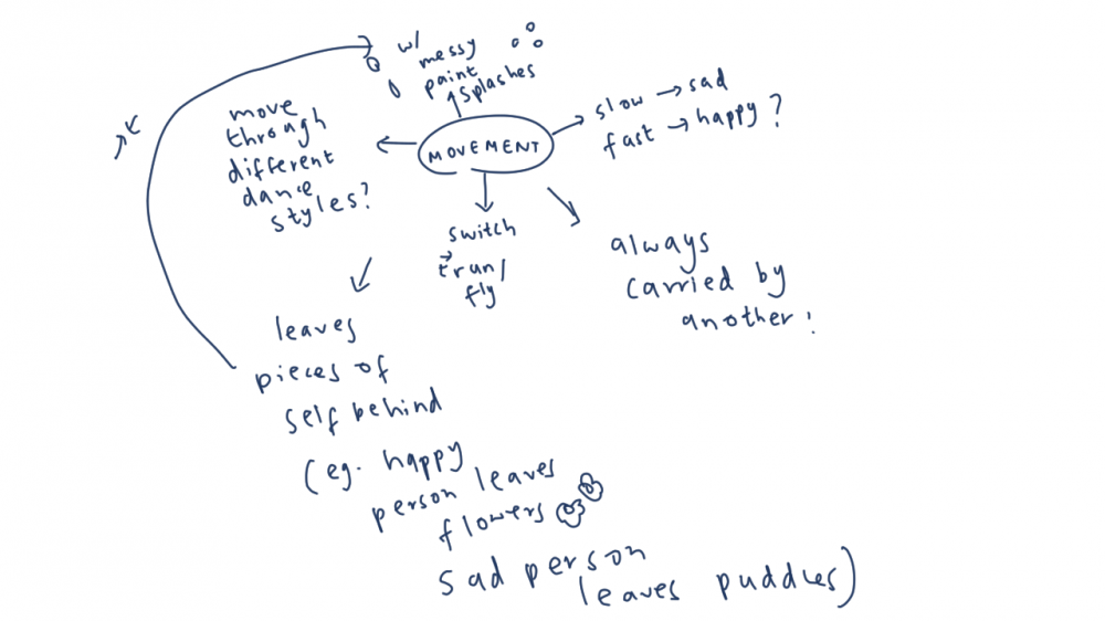In Week 9 of AN, we explored the concept of movement and I drew a mind map exploring a few different options before settling on the idea of characters leaving pieces of themselves behind as they move through the world. A happy character would leave behind flowers and a sad character would leave behind puddles. Although this was a relatively simple concept I decided it would work well if I added the two into a series of scenes together thus creating a storyboard.