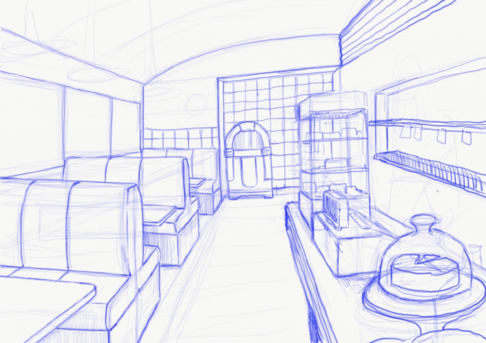 This week I came up with an idea of story at the diner. As I've examined on the idea of using perspective from last week, I choose an interior space to be the location. The american style diner could be an interesting place to create the story and connection between characters. Compared to other restaurant styles, american diner's costomers could be either groups of family or an office worker who comes alone. There's wider range of characters and space between them, which will be interesting to create connection between them.