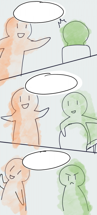 First of all, my original idea was to use a four-frame cartoon to tell a tricky story between friends. I usually draw scenes and blank dialogs first, and edit the dialogs at the end. When I finished the scenes and looked at the blank dialogs, a great idea came to my mind: What if I don’t add the exact content of the dialog? It can be anything.