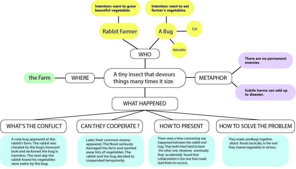 According to what I learnt in class, I use mind map to put my thoughts together, which helps me add more plot to the story step by step. I came up with a simple story through the many factors listed. Then after some suggestions and reflections, I revise the story. In the initial version of the story, the metaphor was about subtle harms can add up to disaster. By receiving advise from Kate, I decided to give the rabbit and the bug a common enemy---the flood. Under the threat, they learnt to collaborate with each other temperately.