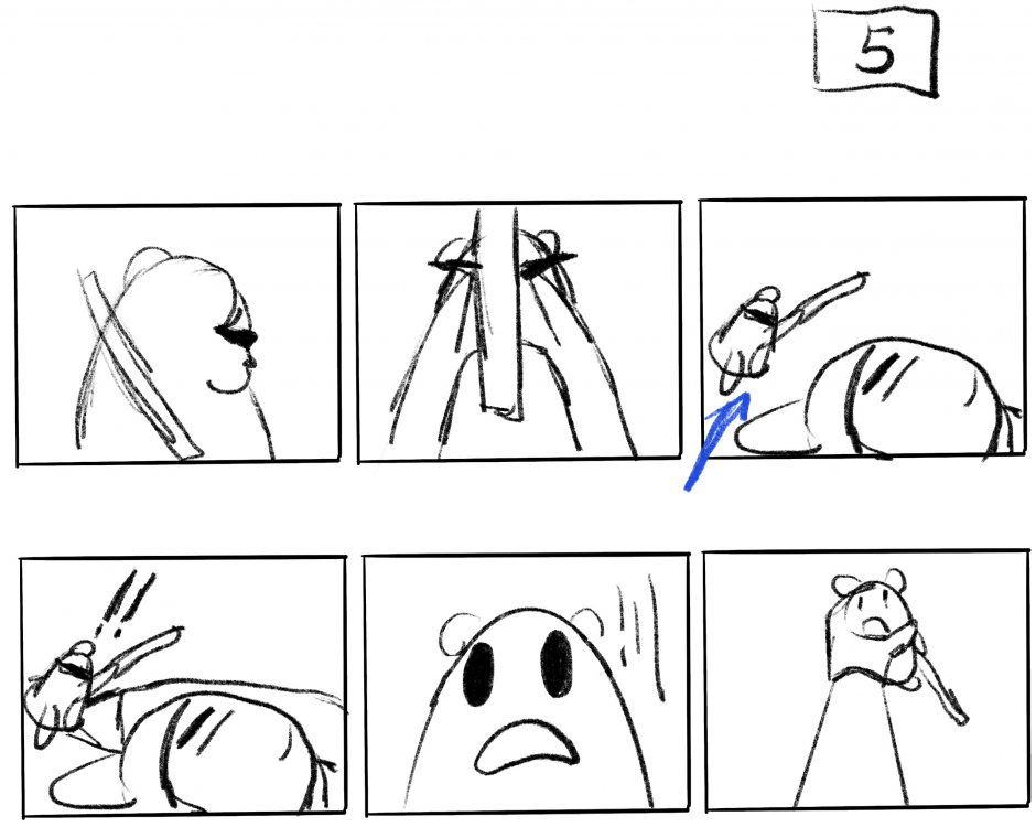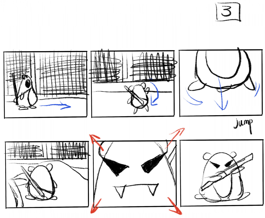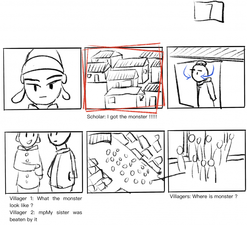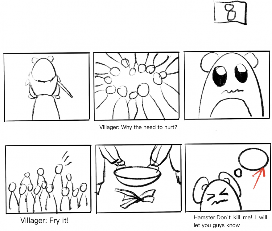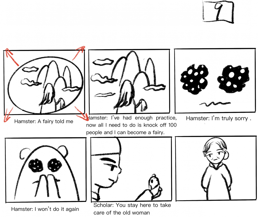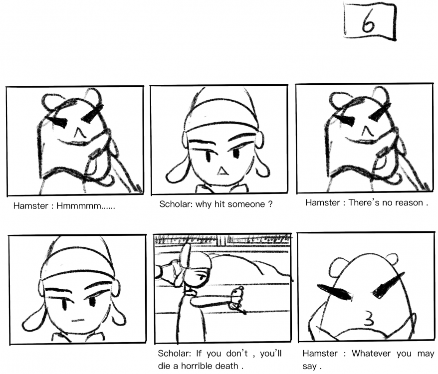 The theme of this story is an adventure animation, the protagonist is a hamster and a scholar, the story of this work is from the Chinese classical novel adaptation. This work can show the loveliness of the hamster through the animation of squeezing and stretching. The deformation phenomenon of squeezing or stretching will occur while the object is moving under force, which can create the illusion of flexibility and vitality for the audience, and can also provide the viewer with information about the hardness and softness of the object. The anthropomorphic movements and character of the hamster are similar to those of Pixar's Ratatouille (2007) and Rob Minkoff's Stuart Little (1999). At first I wanted to continue using a simple textual narrative approach to present the story, but after studying Tsai-Yun Mou's paper From storyboard to story: Animation content development, which compares two different approaches. The results show that storyboarding as a method of creating animated content is feasible, and that a good story structure can still be created using a storyboard-driven approach. The contribution of this model is more in the story climax, resolution and plot than in the traditional process. The results of this study can help novice designers with animation content training. So this time I chose the storyboard approach to storytelling.