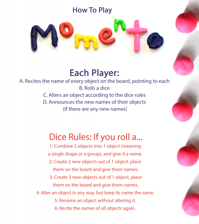 E. The next player then points to and recites the names of every object on the table so far, rolls a die and repeats the cycle. This eventually creates more and more, smaller and smaller objects, memorizable by their shape, placement, relationship, group, history etc.