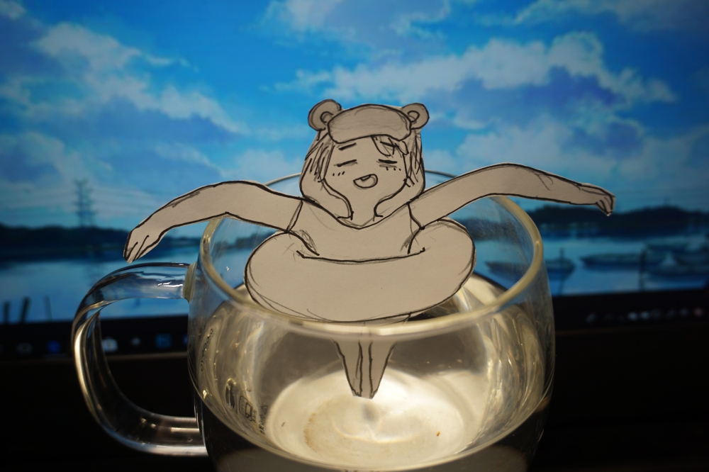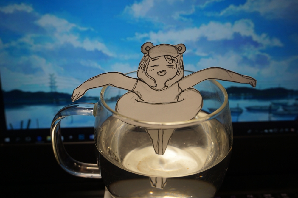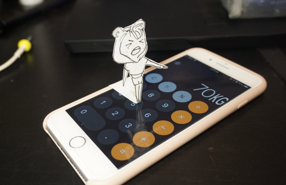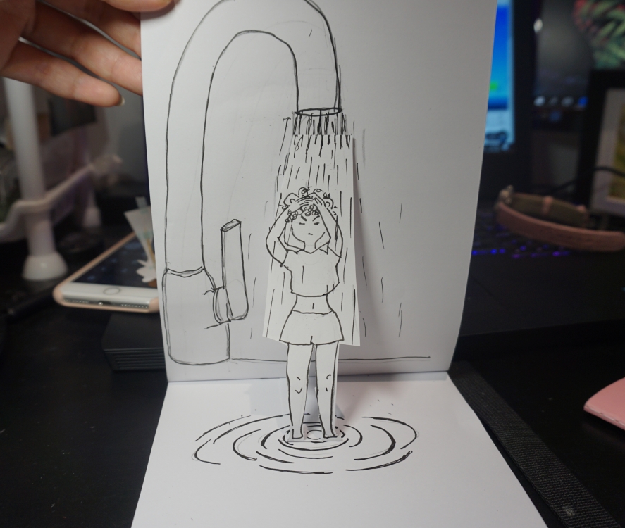 Draw my character on paper and cut it out. Different character's actions match different real scenes. The first scene is the character take a shower and two papers form an angle, the girl stands between two papers. The effect is like 3D. The second scene is the character swims in the cup. The third scene is the character stands on the scale weight.