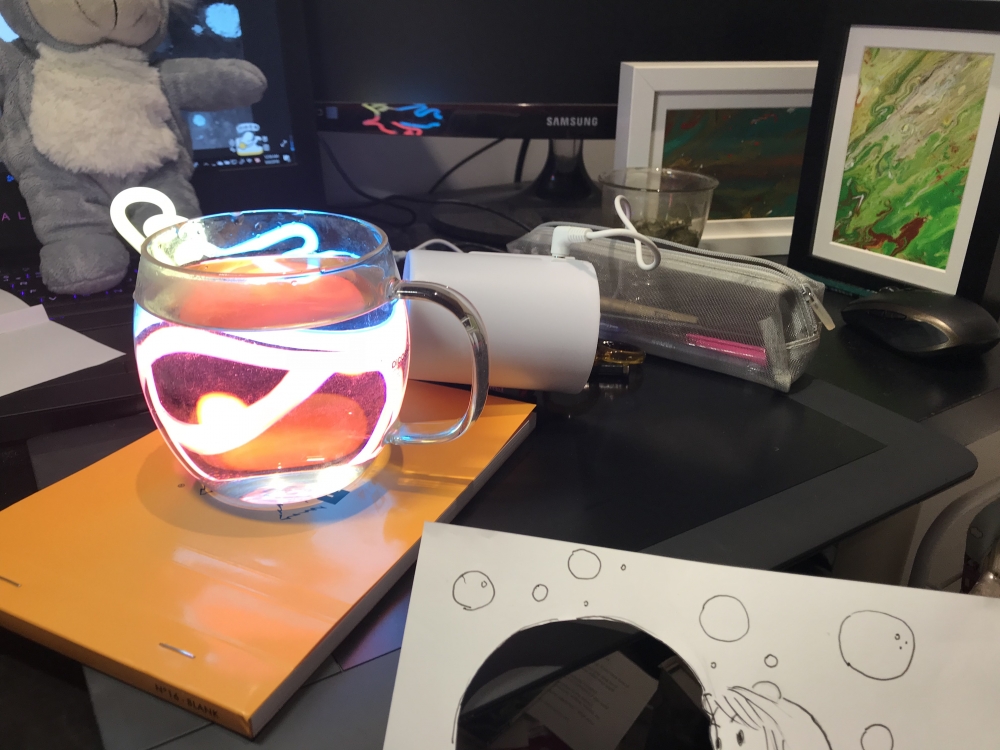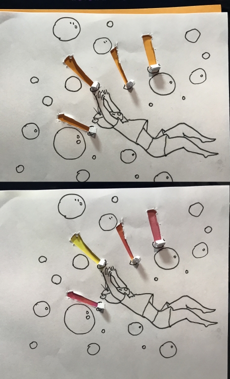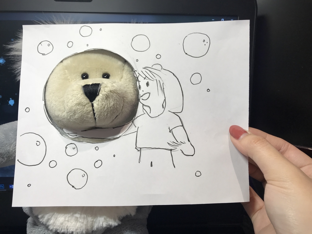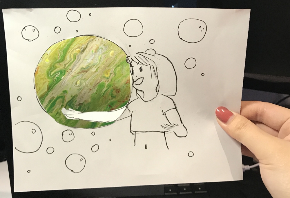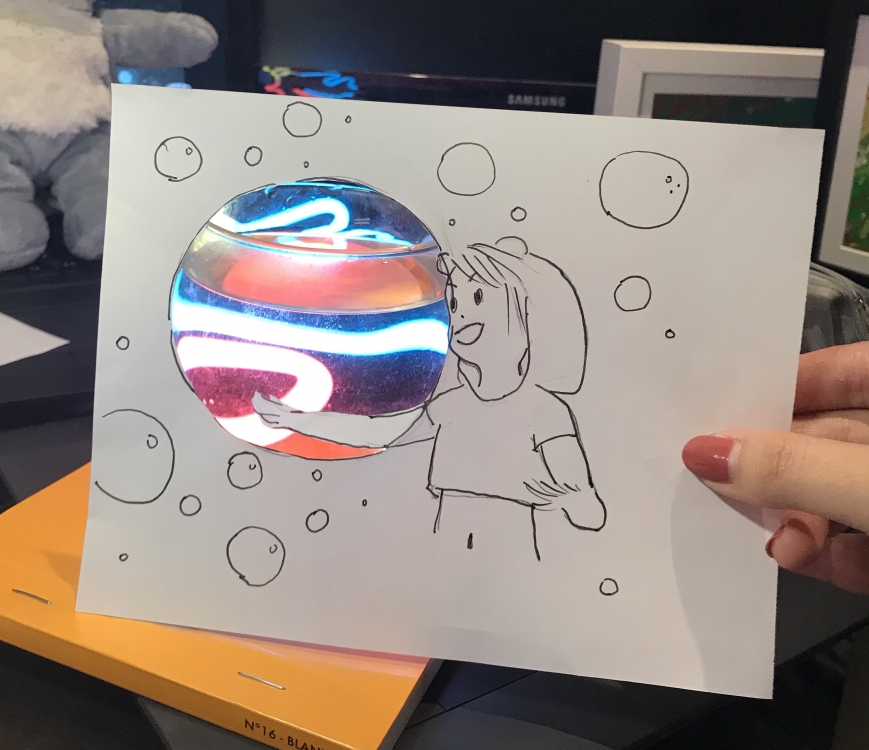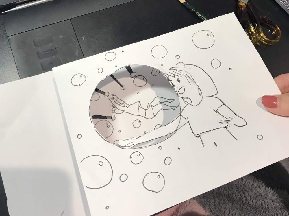 I choose a frame of my animation that I done in studio 2 project (a girl holding a bubble). I draw it in a paper and cut off the bubble. Putting different objects behind the paper creates special effects. Through the circle of the paper, the bubble can be anything.