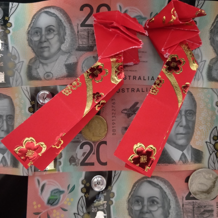 In response to the theme of Found Objects, I made an origami composition that represents Lunar New Year using red envelopes and banknotes.