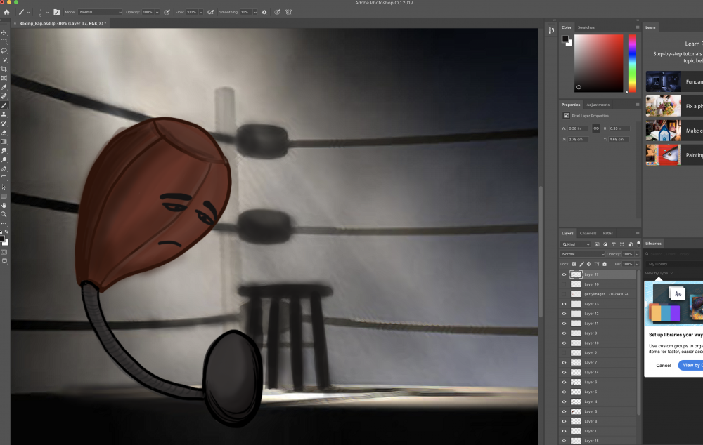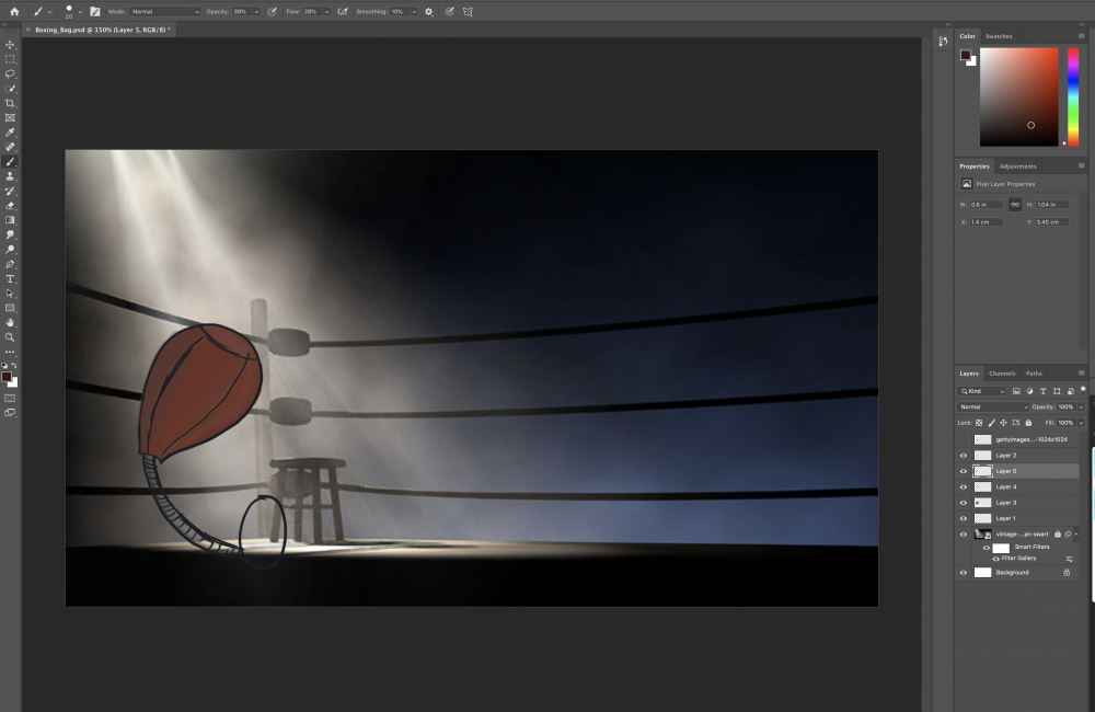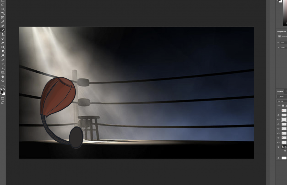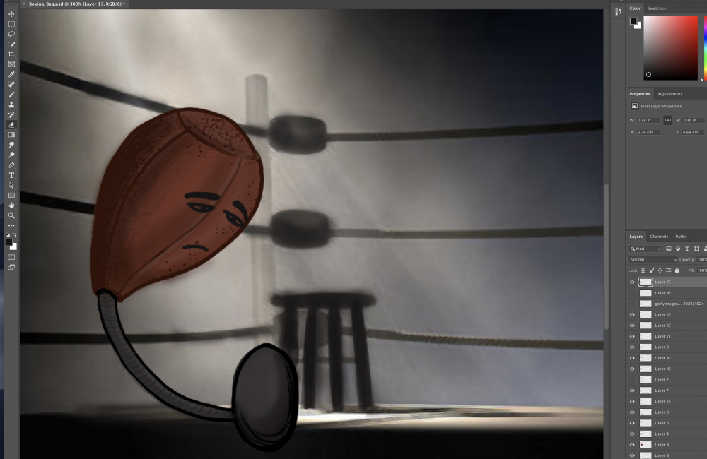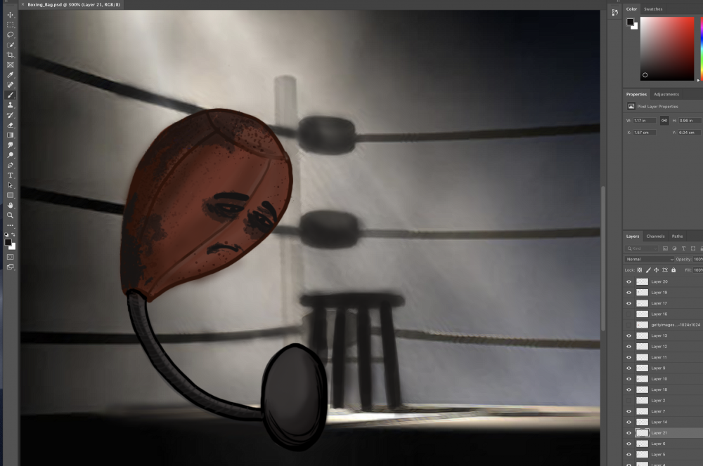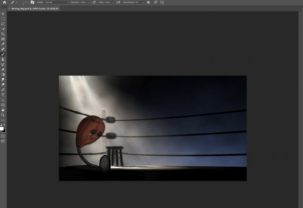 This developed into a thought of "how do I express the feeling of being used as a punching bag?" and thought perhaps there was an opportunity to use this experience as a response to this week's theme of Character. I decided to do a quick digital sketch in Photoshop of an old punching bag, with the application of personification, in order to humanise the punching bag and create human emotion behind what it feels like to be a punching bag and reflecting the idea of being abused over time whether it be physical