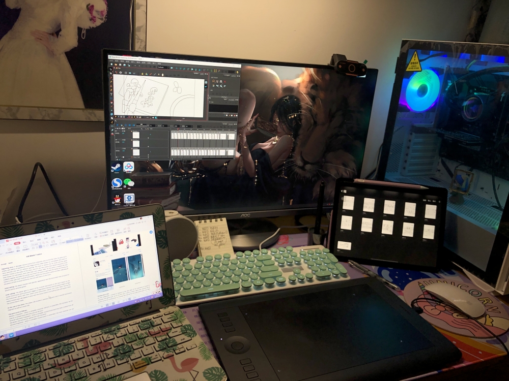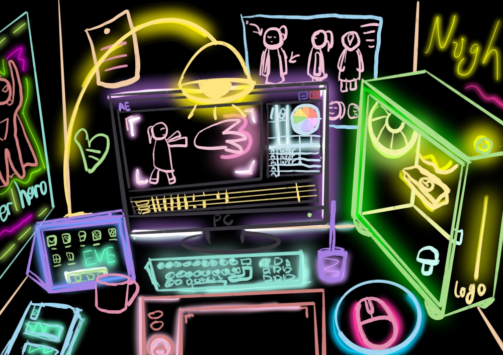 In response to the theme of characters, environment and events, I made two illustrations of how a desk would look with and without light. The environment has a great impact on the character, different environments suit different characters, for example, a warm light-colored bunny in a colorful neon world is very inappropriate. Similar work is "Alike". Alike is an animated short film directed by Daniel Martínez Lara & Rafa Cano Méndez, the animation is about a father and his son, the father has his specific work environment and the son has his school, the environment and the characters are very suitable for this animation, so I also used it to create this desk.https://www.youtube.com/watch?v=kQjtK32mGJQ&list=PLf2DjE5RH6X8jk06g0zpmCwjRCbXSV04a&index=5