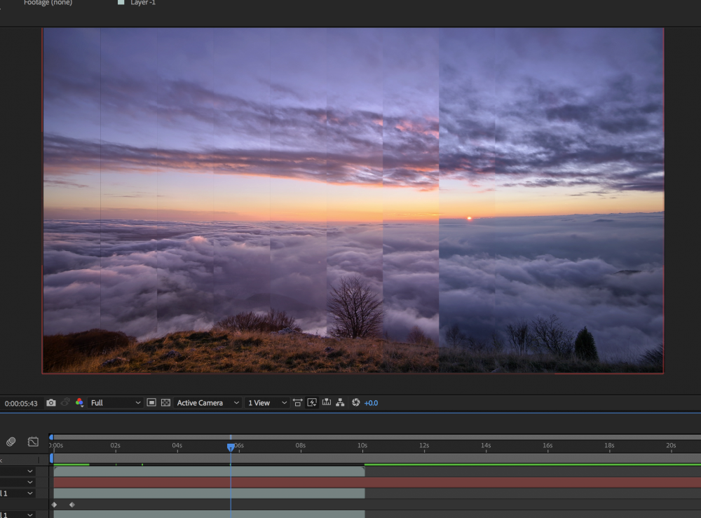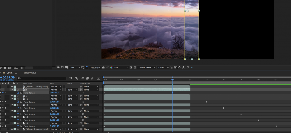 I chose to use stock footage of a timelapse just to play around with the idea of fragmenting time within a single frame. I may want to explore this idea in the future, with video that I capture myself given the proper equipment for a timelapse. A timelapse was the most appropriate footage I thought for this piece, as they are in essence captured long duration time compressed within a few seconds. Timelapses are also a good example of combining authored time, and captured time. Slowing down and speeding up a timelapse footage would also create the most movement within each fragment, as well as further elevating the abstraction of captured time. I would want to explore this treatment in future work, as it may also be effective using a simple looping animation. This could also result ininteresting visual effects, or to explore heirarchy of information in a time-based moving work.
