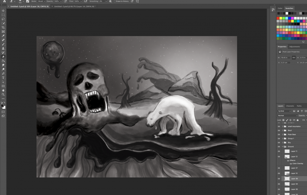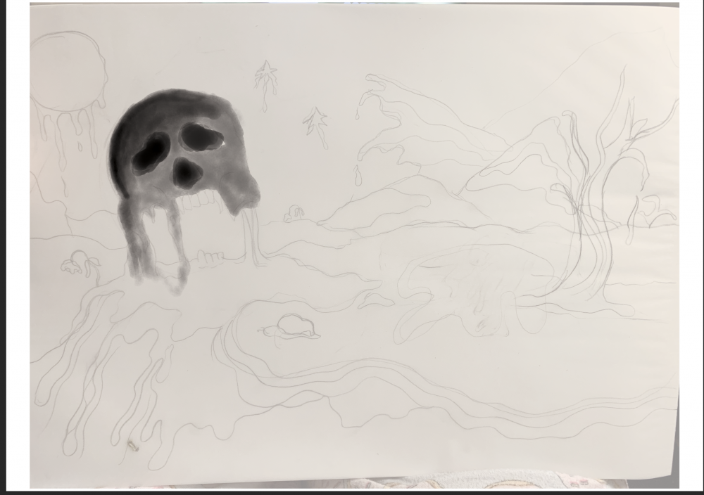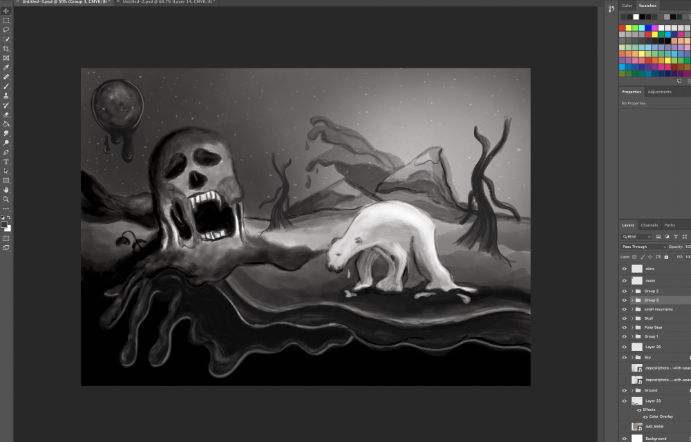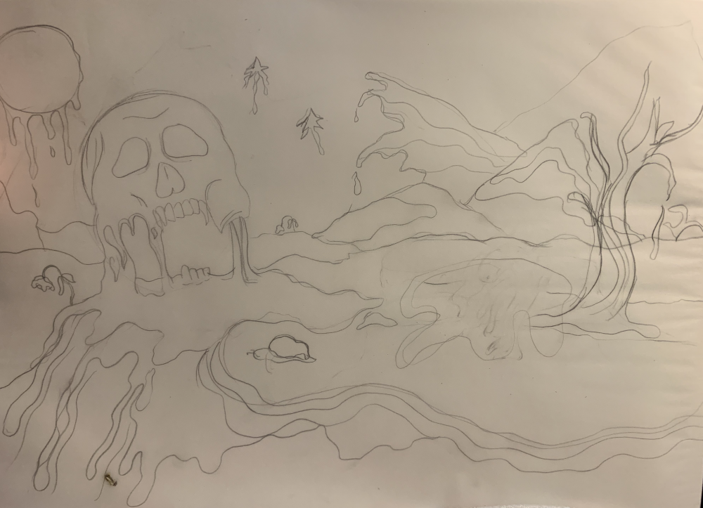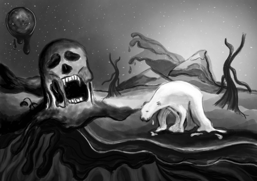 I began by sketching out a rough layout for elements and started painting it out in a rough manner in photoshop. The outcome reflects the idea that the earth is melting due to global warming and demonstrates the earth being alive through the skull reaching out of the ground, along with every other element melting.- whether it be the moon, mountains, trees, polar bear, ground or flower. Through trying to illustrate trees melting, they inadvertently became characters themselves and appear to be live figures walking their way through the land as they slowly melt away. By applying the black and white rule, this provides the context with a grim and hopeless outlook of the events occuring.