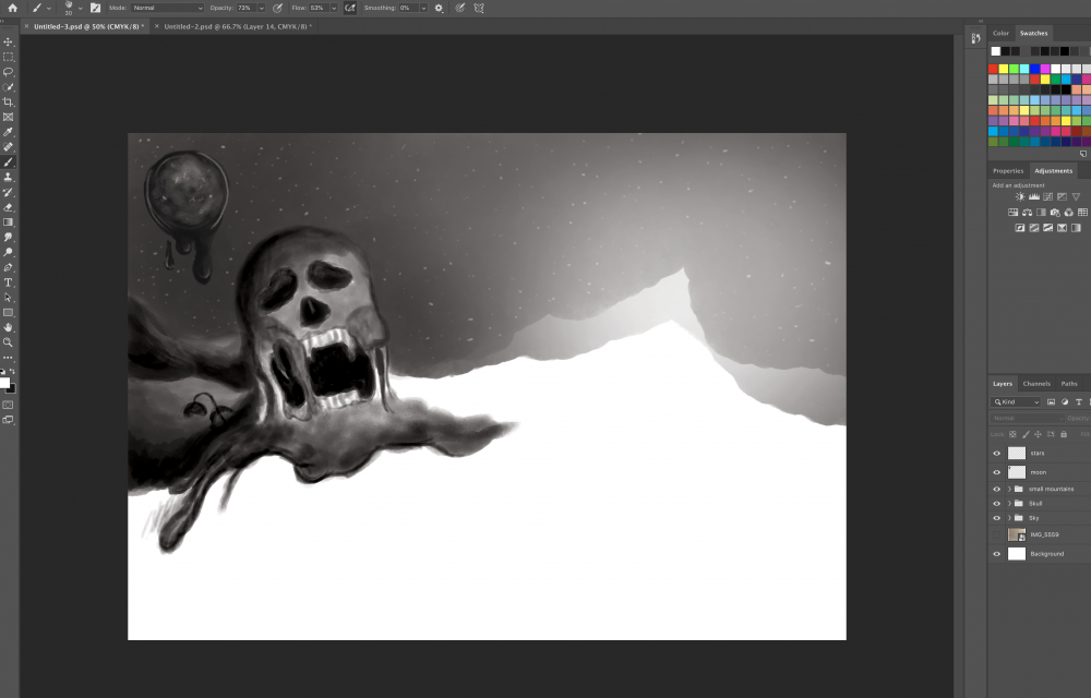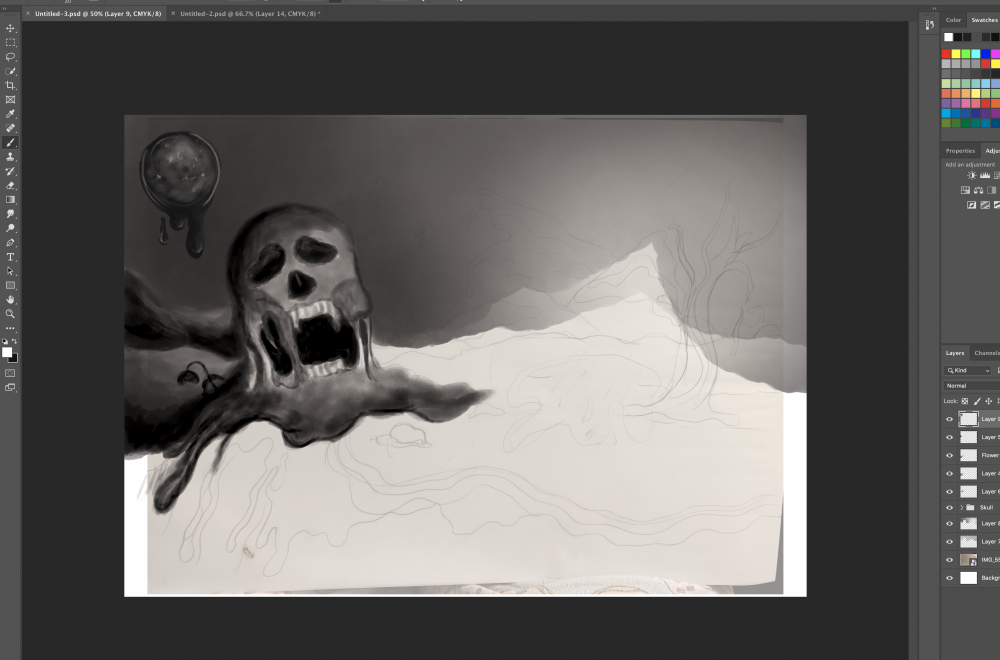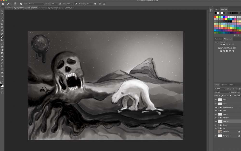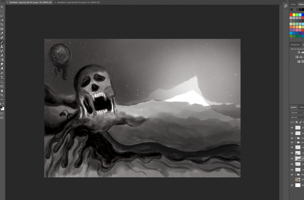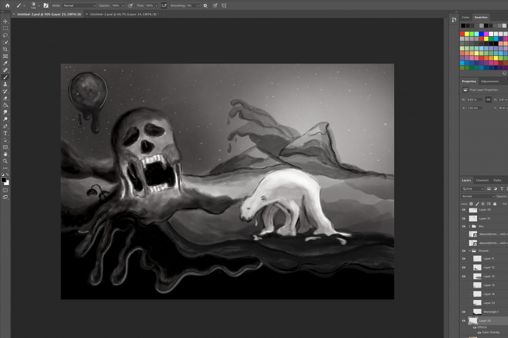 I began by sketching out a rough layout for elements and started painting it out in a rough manner in photoshop. The outcome reflects the idea that the earth is melting due to global warming and demonstrates the earth being alive through the skull reaching out of the ground, along with every other element melting.- whether it be the moon, mountains, trees, polar bear, ground or flower. Through trying to illustrate trees melting, they inadvertently became characters themselves and appear to be live figures walking their way through the land as they slowly melt away. By applying the black and white rule, this provides the context with a grim and hopeless outlook of the events occuring.