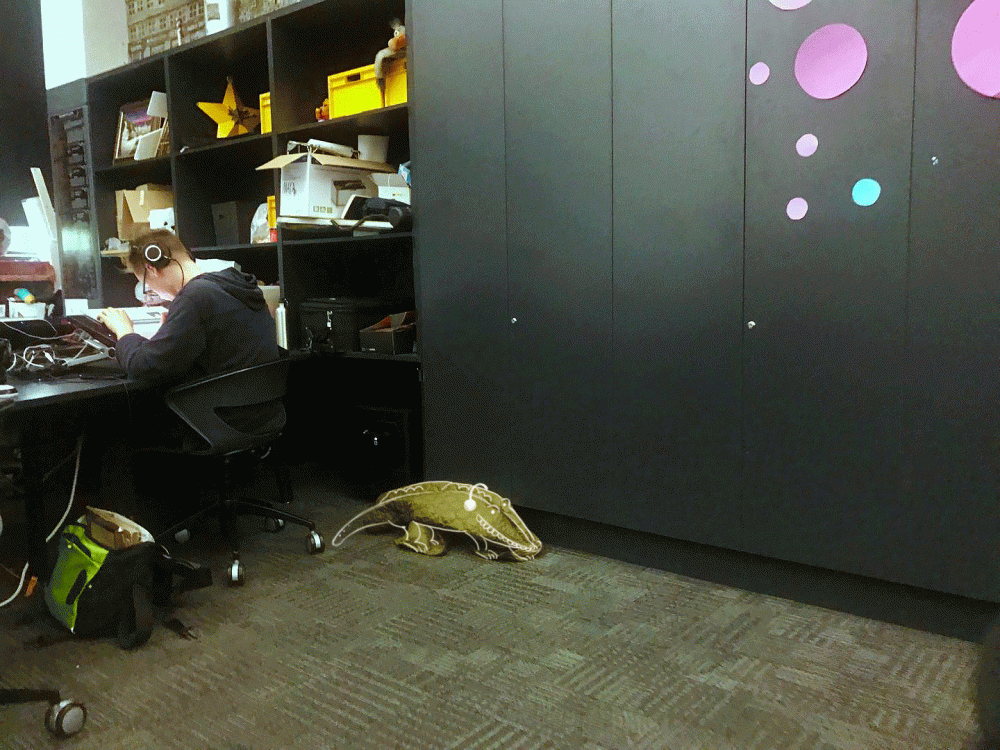 For the first week, I observed the environment around me and tried to find out the relationship between people and stuff around them. My question was about will they affect each other. So I took this picture, there was a green coat on the ground and the shape of it looked like a crocodile, I used TVPaint to draw on this coat. And I draw a headphone on the crocodile because I want to create some similarity between it and people. After this test, a relationship can be felt between the coat and people and we can feel the emotion in this environment. It looked like a happy environment and the crocodile felt exciting of the music.