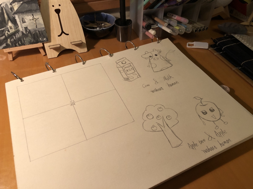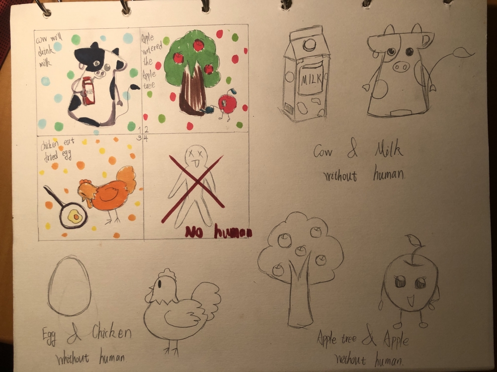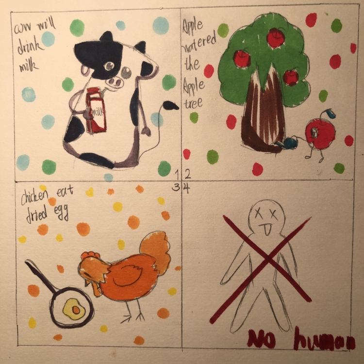 In response to the theme of object oriented ontology, I drawn three paintings about cow and milk, apple and apple tree, chicken and egg. If this world never have human being, what kind of life they will live? If have chance I may create a series of animations about this theme. Similar works such as Hound (2016) by Georgia Kriss, this is a commend video from CPS class, that is very interesting about animal oriented ontology. Animal do weird thing but accord with their instinct, very imaginative and depart from the normal. Another related work is Animanimals: Octopus(2016) by Julia Ocker, this work show a is cooking, cute and suit the theme of this week.