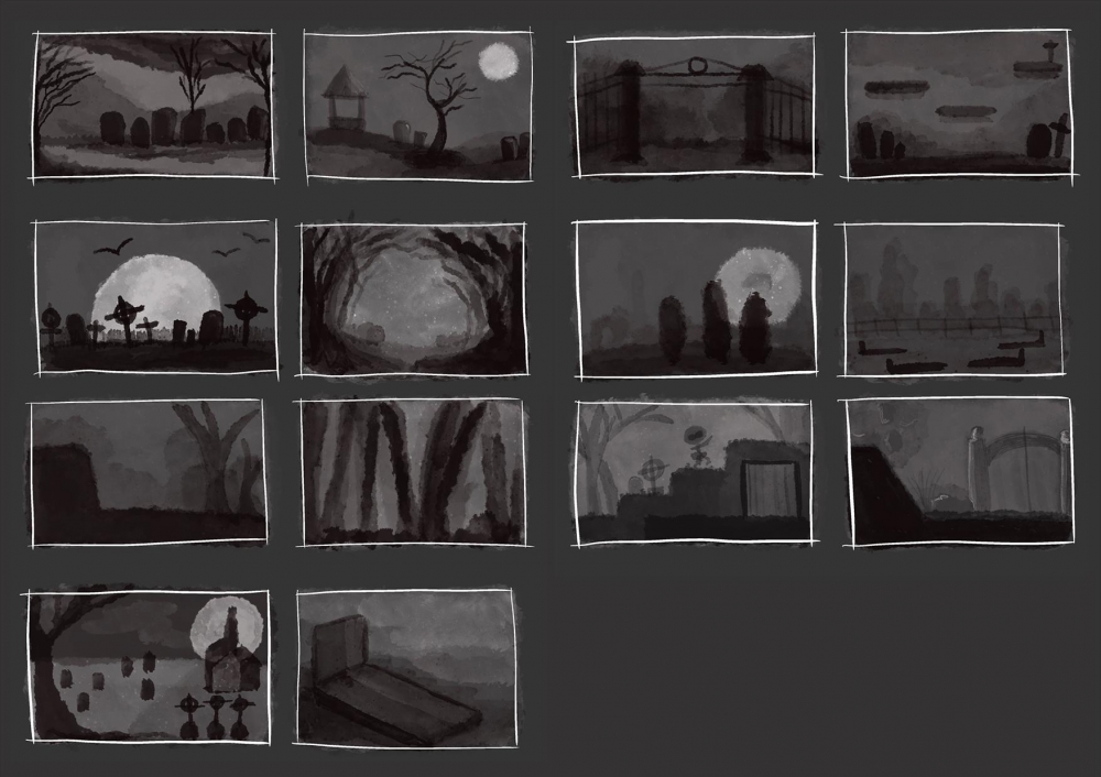 Following on from the week 2 workshop, I generated some thumbnails based off the two key locations I will be focusing on - The Graveyard and The Sewers. This was meant to help generate some pathways, potential locations and objects to explore, which I could then expand upon in order to create some concept art and further details within the space. I wasn't really sure of the direction of either of these two locations and how they would fit into the style of my initial aesthetic design from studio 1, so they felt like good options to explore further.