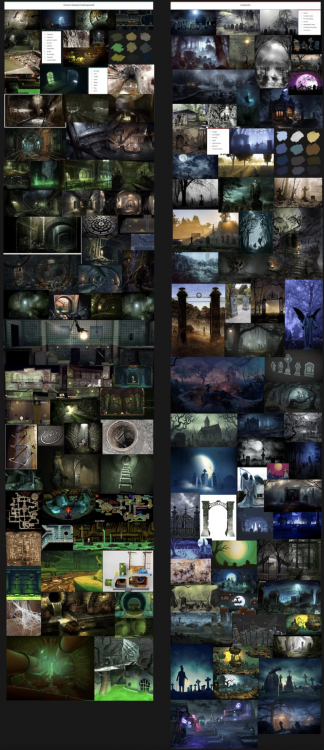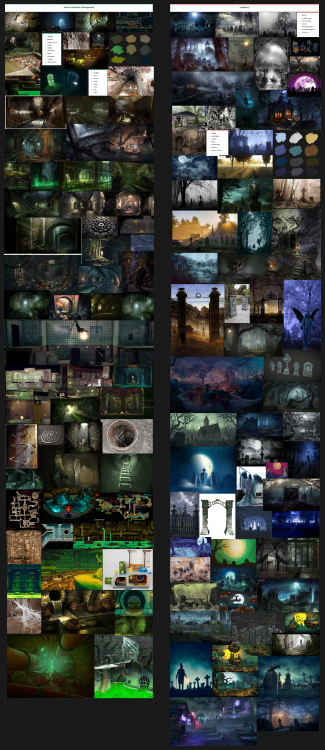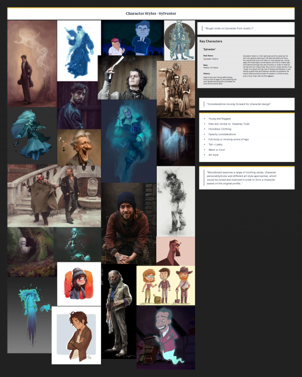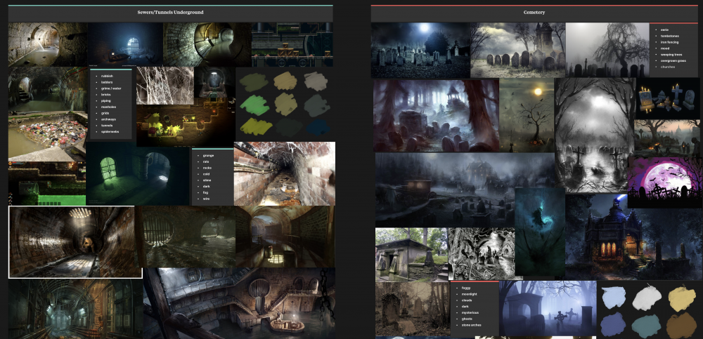 The moodboards focus on 2 potential environments to explore with sketches and layout, one of the characters and some props that are used within these two environments or weaponary/inventory.