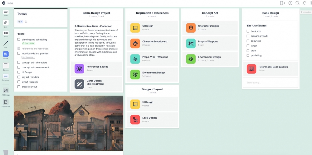 I also setup Milanote to manage the project and dump ideas throughout the production process. I usually find it too overwhelming using multiple different programs and have spent the last few years working in Monday.com and Milanote through work, so have decided to run with Milanote for this project.