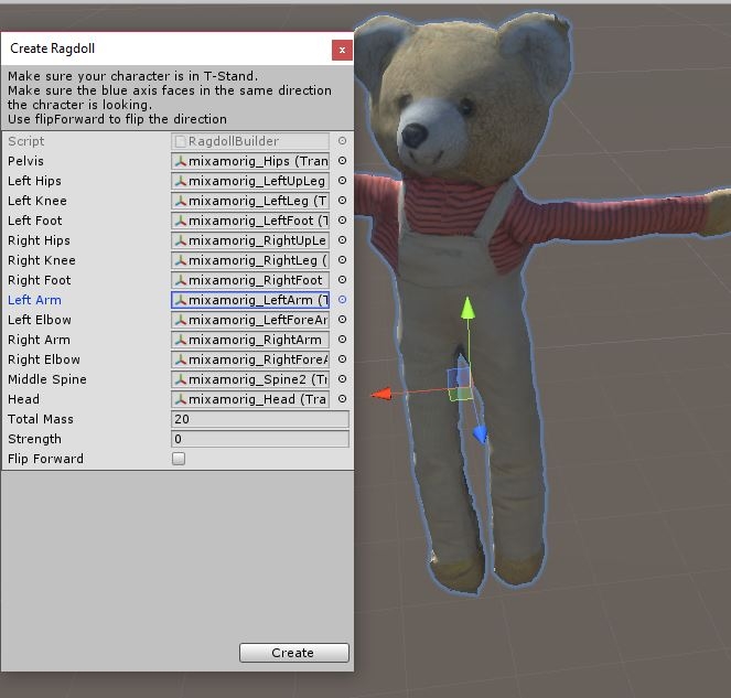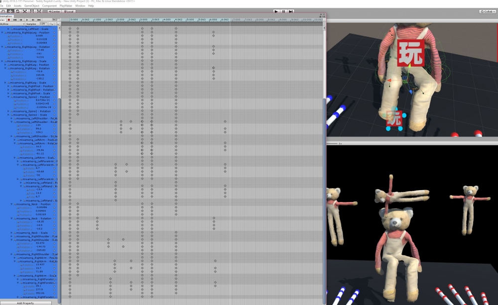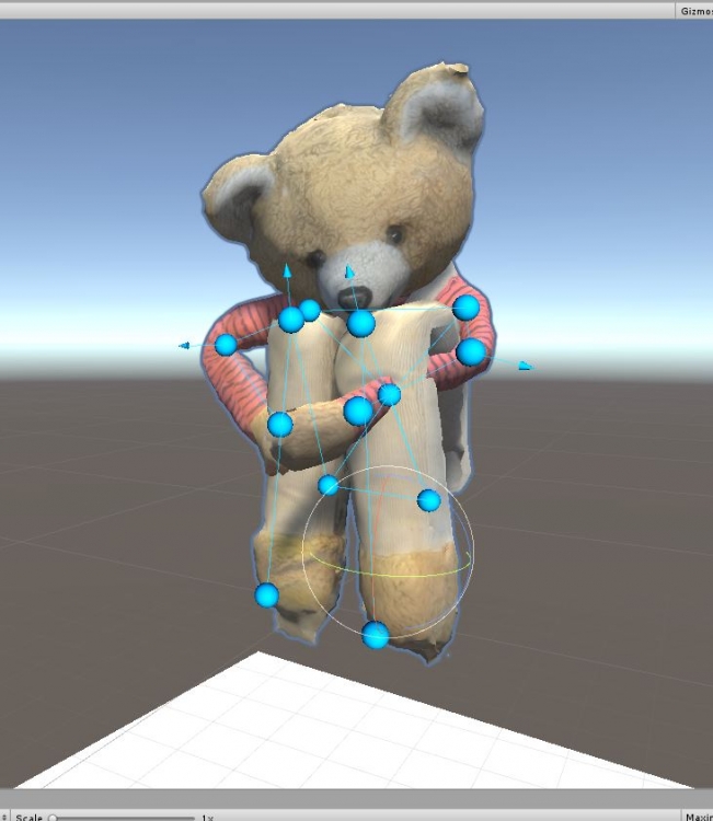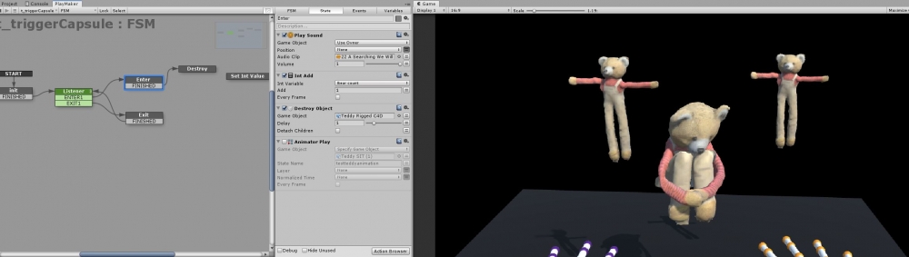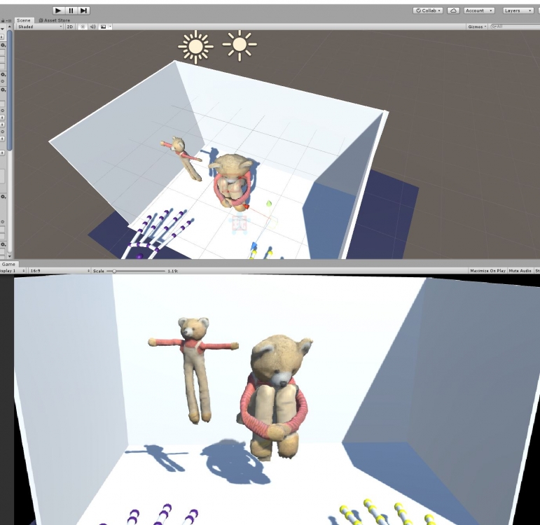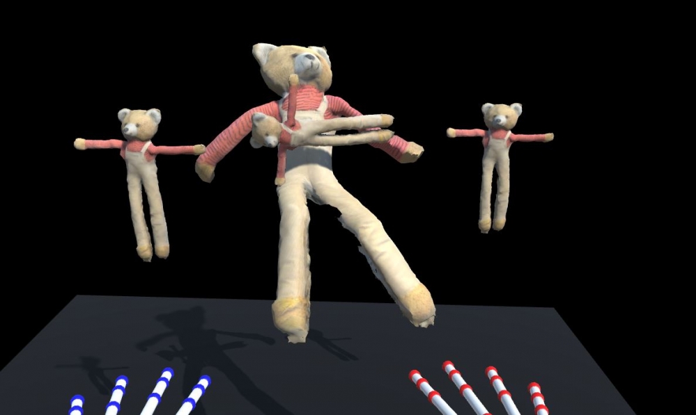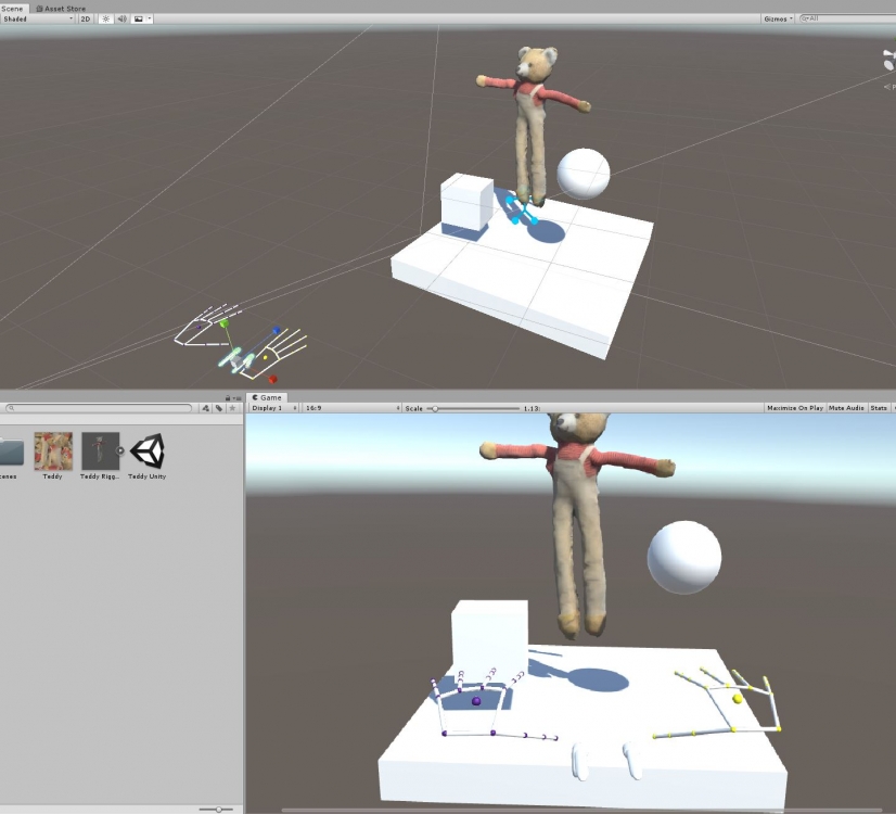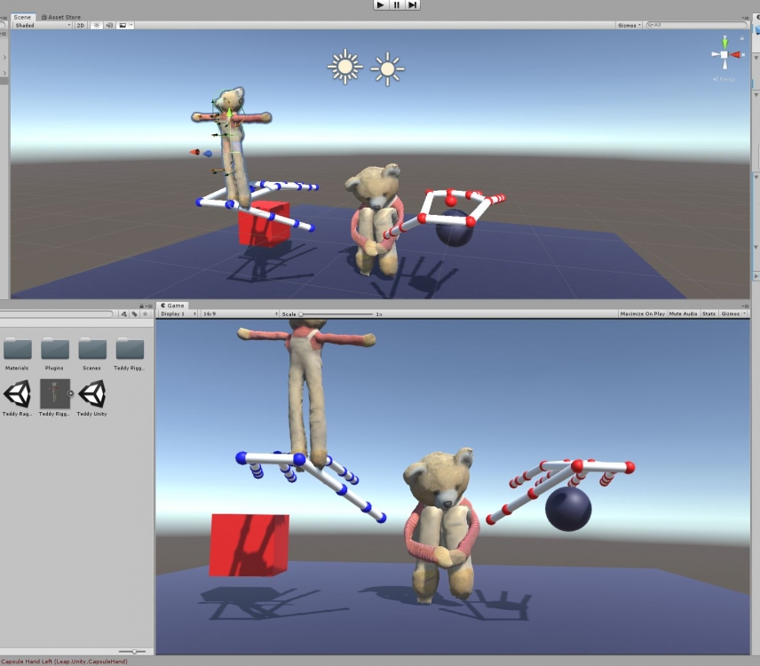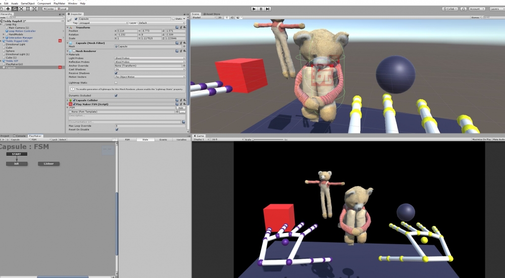 Teddy would be projection mapped in physical space with the Unity Teddy. The coloured teddys represent memories/emotions. The player interacts with it using leap motion without an objective. Attempting to place all 3 coloured teddys in the sitting down (projection mapped) teddy will wake it up, enabling the user to interact with it as well.