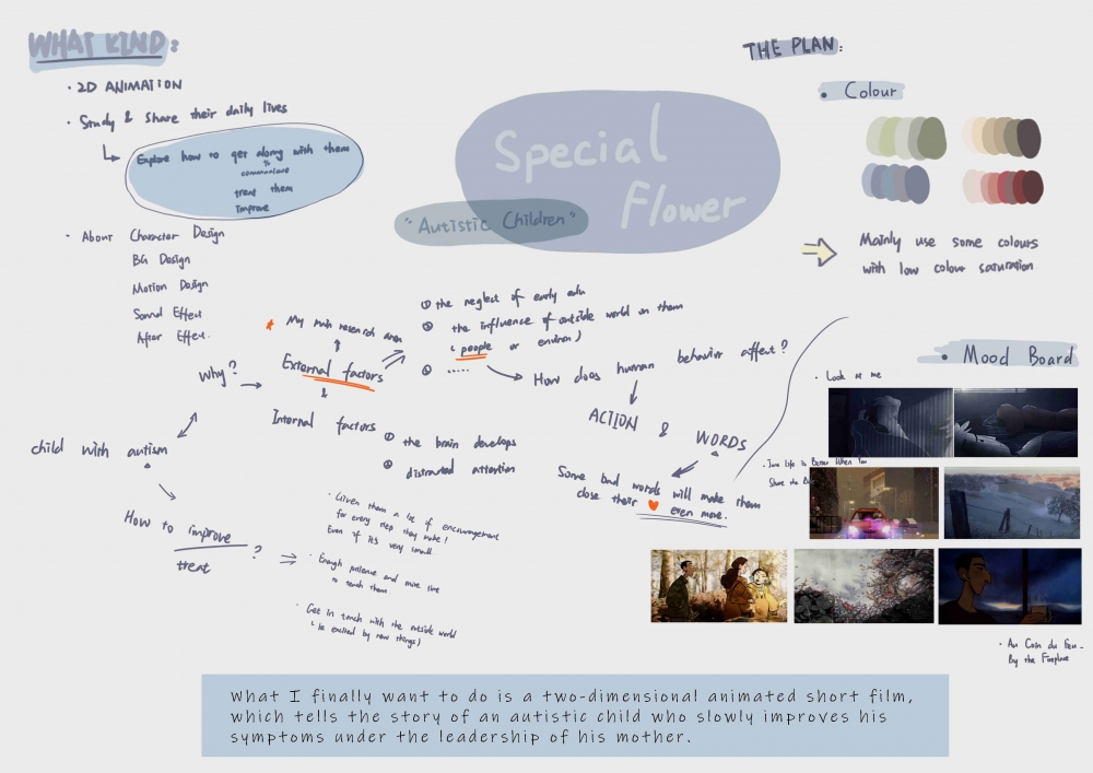 First of all, because I did an experimental animation in Studio 1, this time I want to do a two-dimensional animation with plot, about autistic children. I know that some studios or individuals have done similar animations before. Most of them, as far as I know, describe how a person feels about the outside world when he or she suffers from autism or other mental illness in their works. Personally. I want to share how we get along with these special children and help them improve their symptoms more.