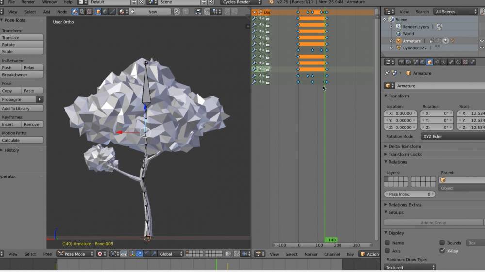 Based on the previously works, observation, I made a looping animation of the movement of trees in the wind. The Armature Modifier is used for building skeletal systems for animating the poses of characters and anything else which needs to be posed in Blender. This function is usually used to move a character, which seems to be suitable for expressing external influences even when wood has very little movement. By using Armature Modifier, I created the movement of the tree that is blown and I applied the animation to Unity.