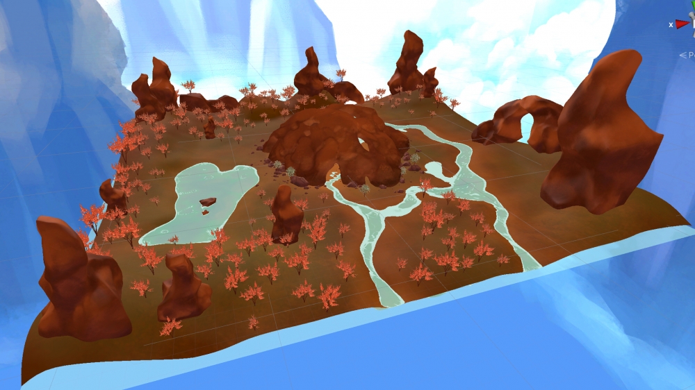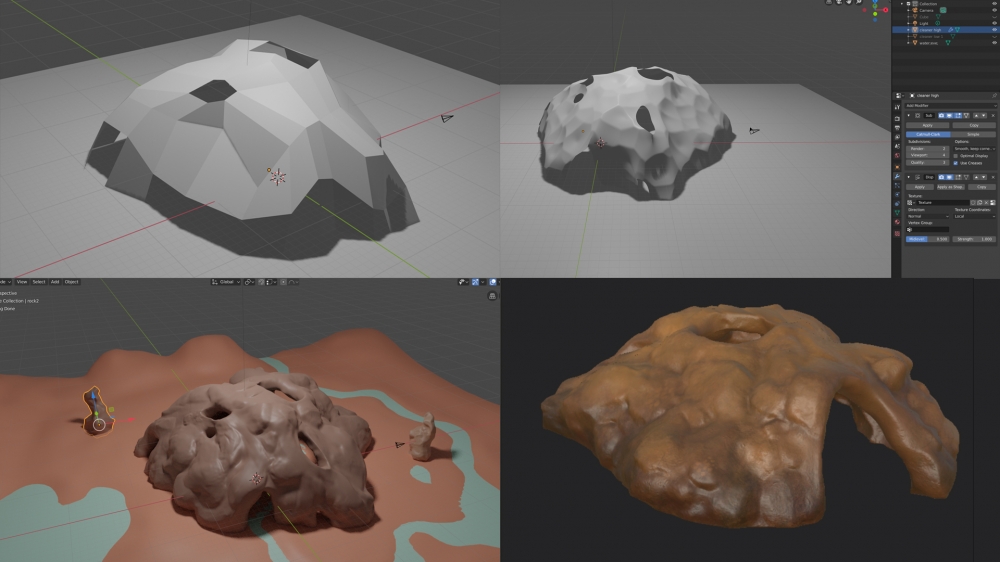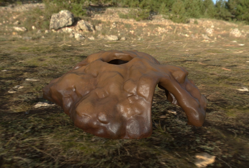 To emphasis the 'mountain' aspect whilst sticking to the lore for one of the creatures, I've designed a cave as the centre piece for the landscape. As part of level design, this sole landmark will naturally guide players towards it, discovering a creature whose core mechanic is very helpful. The first image records the modelling process for this centre piece. A rough blockout was made in blender, trying to work with minimal faces so I could focus on the overall shape. Using the subdivision and displacement modifier, I quickly gave myself a rough organic shape to work with. Sculpting was done inside of blender, then taken to substance painter to UV unwrap and texture painting. A render of the final result is shown on the second picture. It is just quite unfortunate that the exported version doesn't look as beautiful. (not sure what I can do in this case as I was running out of time)
