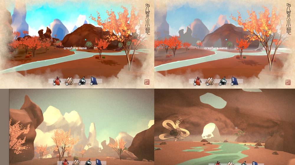 I rebuilt the entire landscape primarily two reasons: a better representation of 'mountains' and 'seas' suggested by the book's title (the classic of mountains and seas), and to make the scene more visually interesting in general.