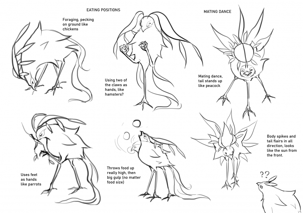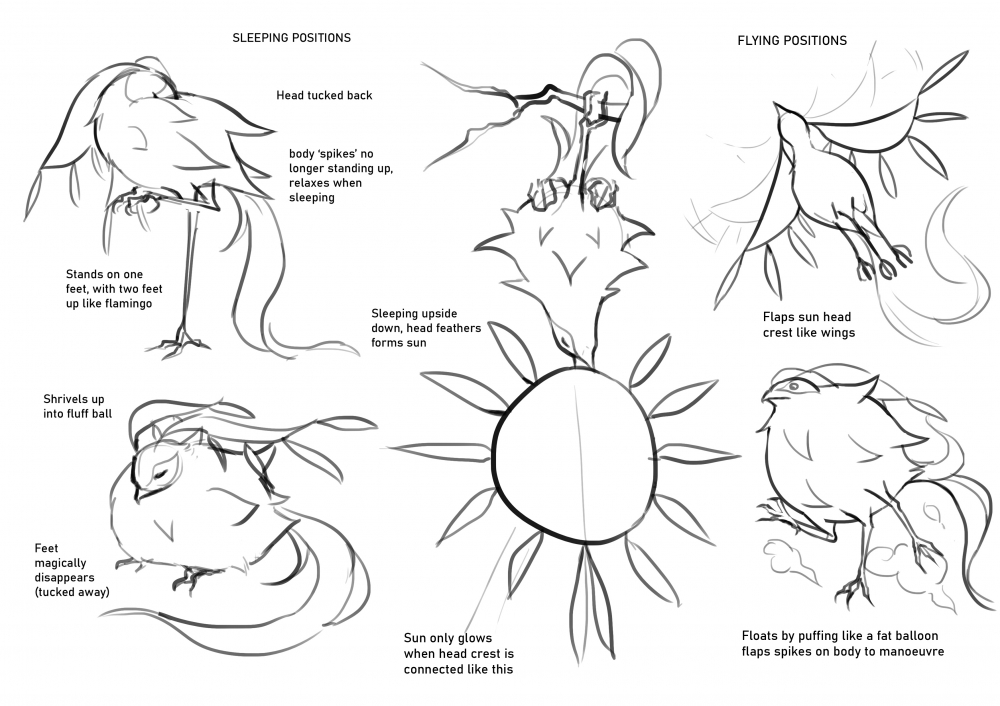 An example of research application is the sun bird 'flying' animation is inspired by hippos. It's little known that hippos can't actually swim or 'float' due to their dense body. Instead, they 'float' through alterations to body posture and breathing techniques, 'swimming' is actually walking underwater. In my case, the sun bird can't actually 'fly'. They puff up like a pufferfish, and float into the sky like that of a balloon.