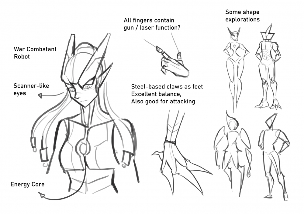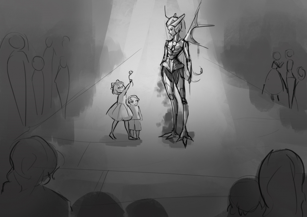 By creating a ‘screenshot’, I seek to capture the composition and ‘mood’ of the scene. As depicted, most people have singled out the robot in the middle and are scared to go closer. The robot appears aloof, cold and expressionless. Two children approach from the side with no fear in their eyes, postured upright to show friendly body language. A single beam of light is used for this scene to draw emphasis to the interaction between a cold, streamline killing machine and small, frail yet warm-hearted children.