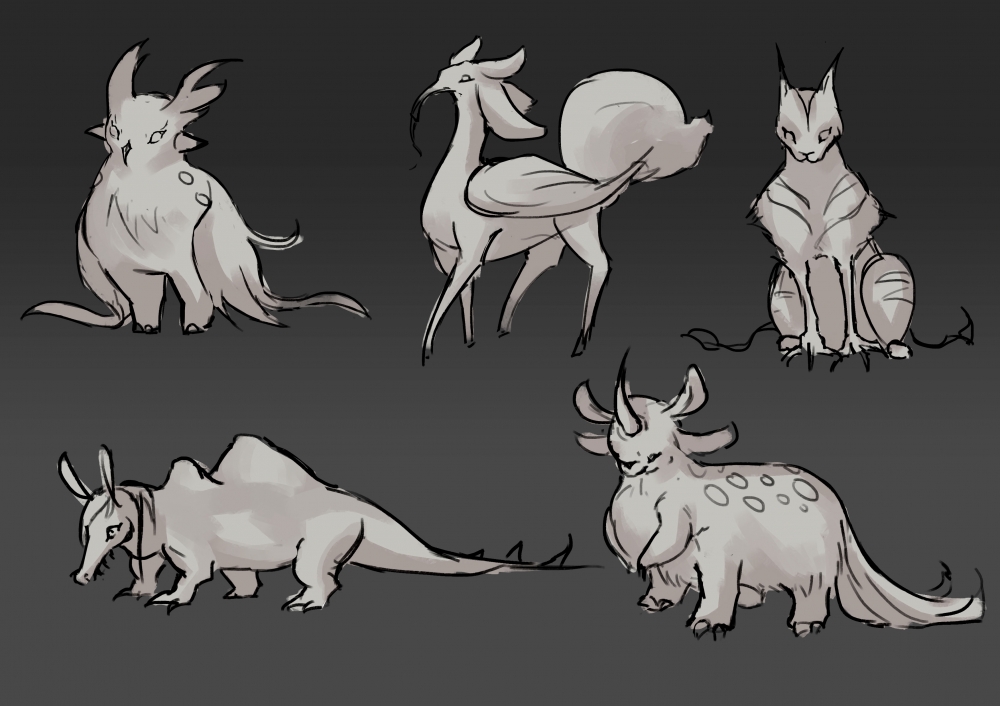 I firstly randomly generated some animals, and used those as a influence to form a basic sketch. These creatures then serve as the basis to form my designs in the second iteration, by combining interesting shapes and features from sketches produced in the first step. By this process, I am loose and experimental with my work and not conformed to creatures that I regularly draw. The first step allows me to discover directions to take my work, second step allows me to refine my work and take the designs in areas that I deemed interesting.