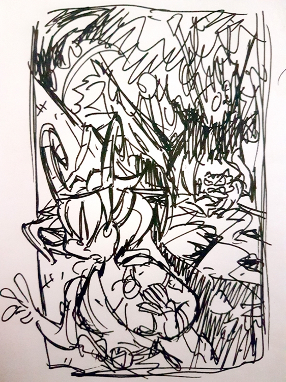 There will be three stages (four if you include the pre-production stage) starting with initial roughs of the page spreads, done in bold black and white to really grasp the initial composition and flow. After a review and annotation, the next stage will be to redesign these panels in rough pencils with three variations of each for another round of review and refinement. The final stage will be to take the best of all three versions of the page designs and refine them while taking into account the review decision and feedback into on fine design of each.